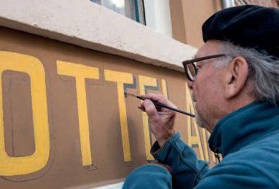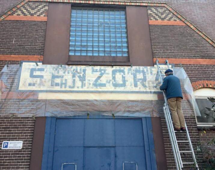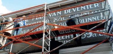 Het oude opschrif t uit de jaren der tig is na een week krabben en twee weken herstel weer terug: een geslaagde reconstructie