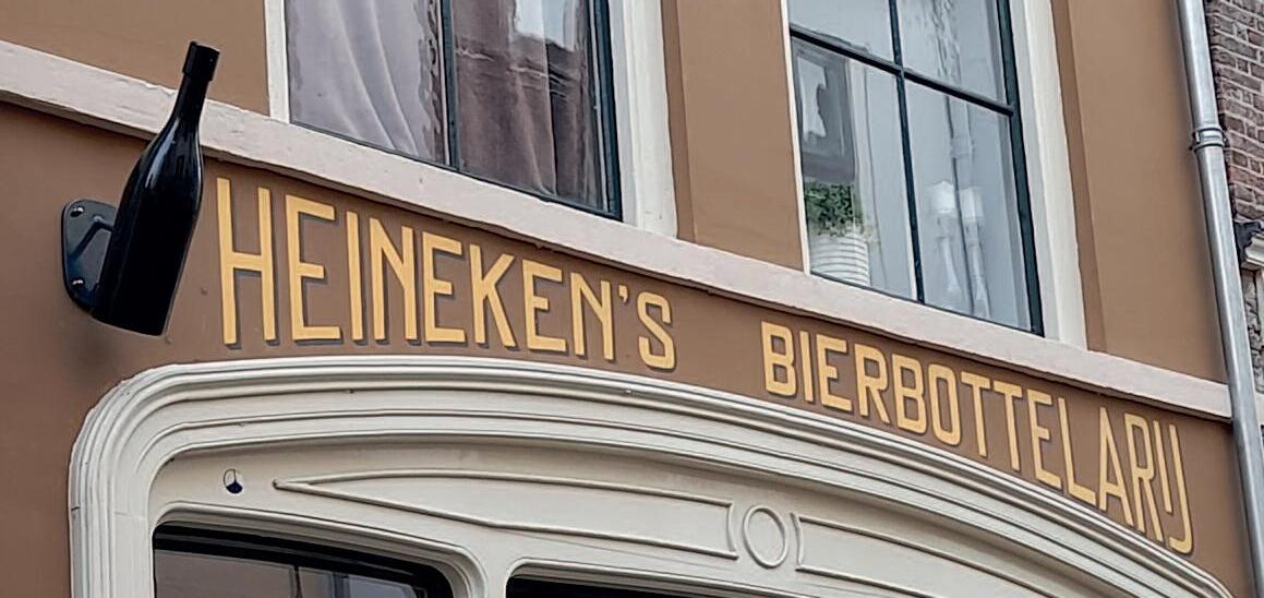 Reclame uit het begin van de vorige eeuw, veranderd van ‘Almelose’ (ging failliet) in HEINEKEN’S De overgetrokken letters zijn na de restauratie van de gevel weer aangebracht De houten bier fles is gemaakt door Han Nijhof, vrijwilliger van de SIED