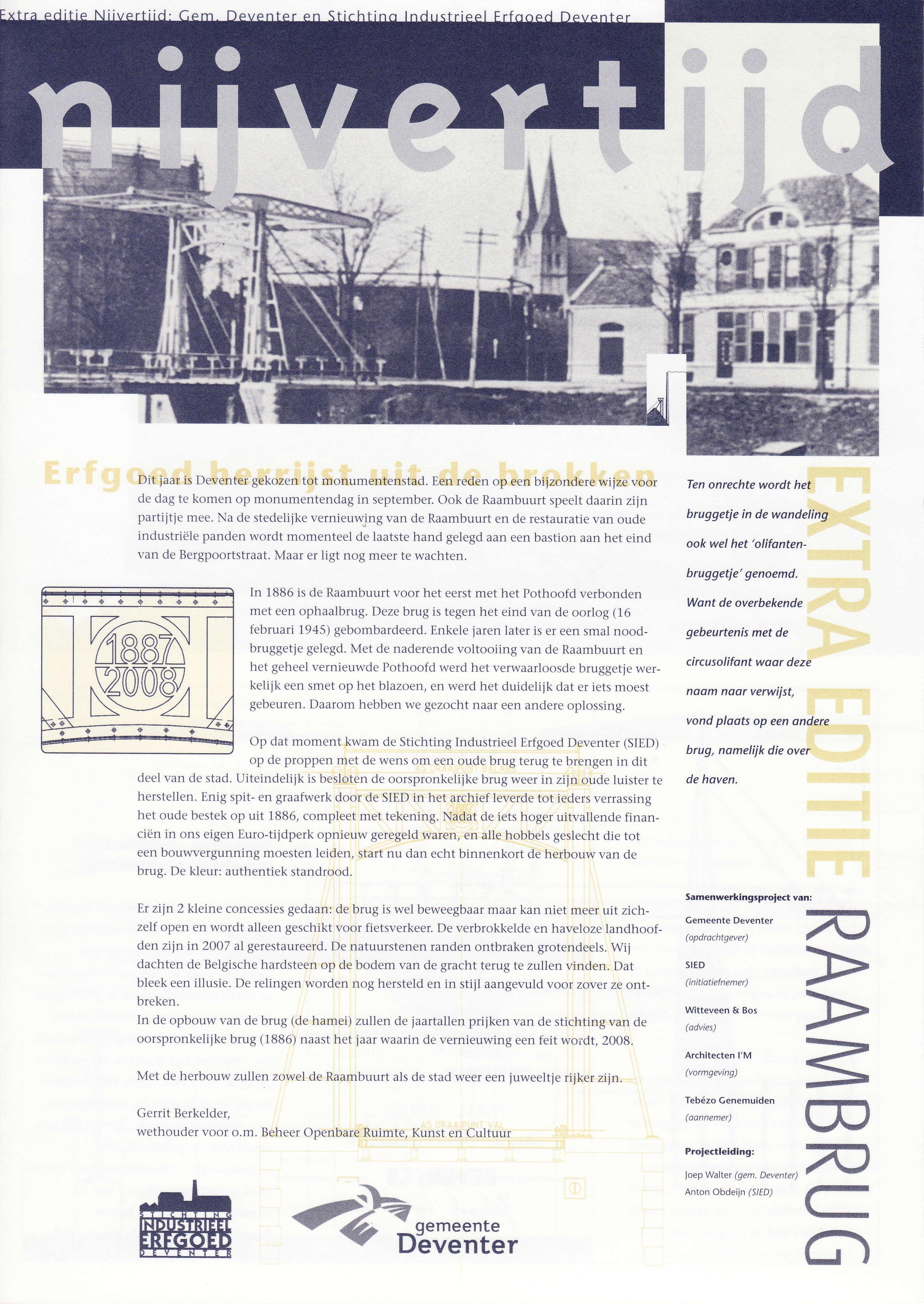 En die brug keert als replica ruim zestig iaar, na aan het eind van de Tweede Wereldoorlog te zijn vernietigd, terug op zijn oorspronkeliike plaats. Ook nu weer als verbinding tussen Pothoofd en de Raambuurt, maar tevens als schakel tussen de wereld van nu en de tijd dat Deventer zich ontwikkelde als industriestad.