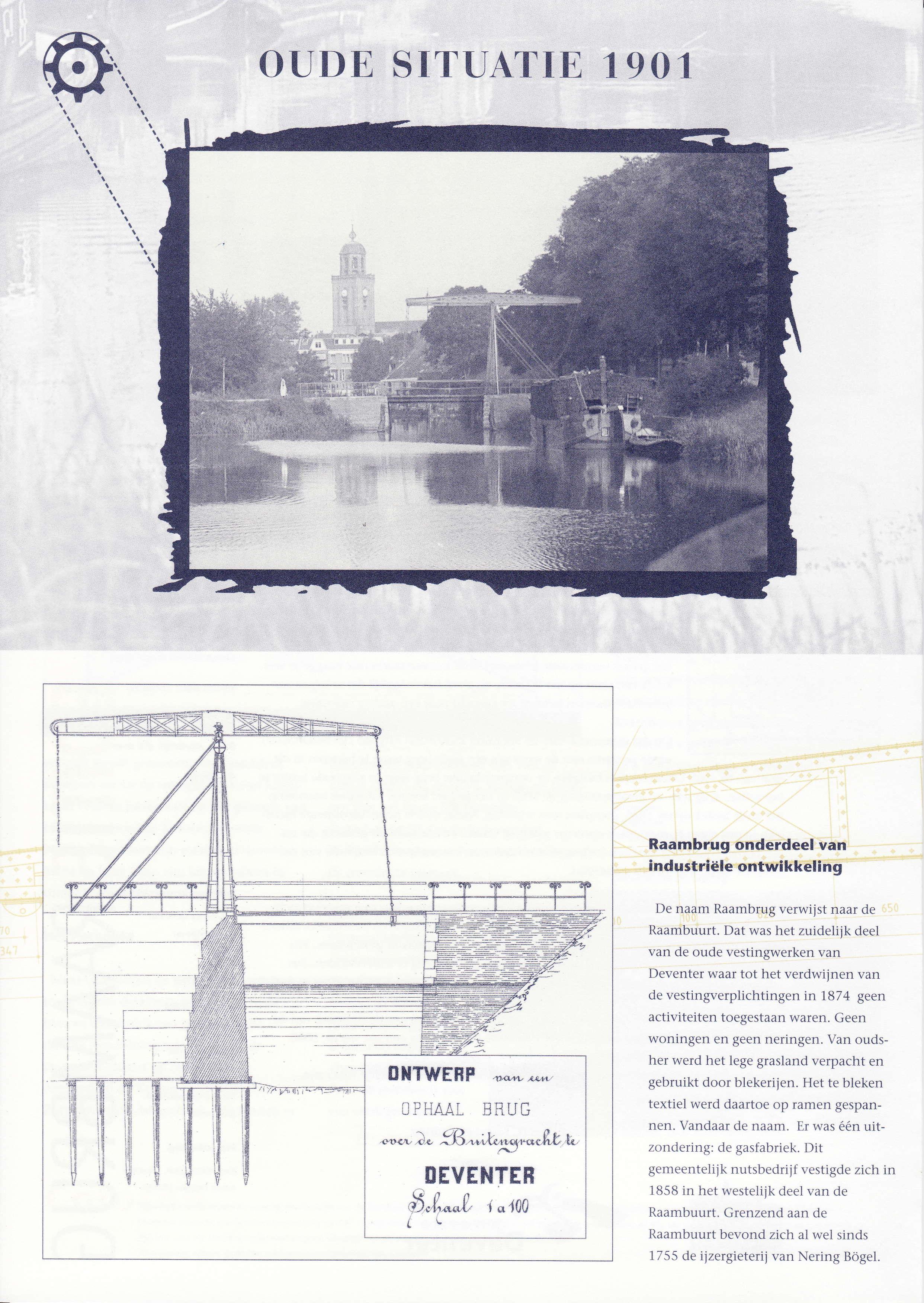 bevolking. Goede doorgaande routes dus. Tussen de Raambuurt en de Deventer binnenstad bestonden van oudsher al bruggen over de haven. Maar om tegemoet te komen aan de groeiende vraag naar bii industrialisatie passendeinfrastructuur wordt besloten achter de sluis in de Buitengrachteen nieuwe, exlra brug te bouwen die direct aansluit bij de doorgaande wegen. De plek is handig omdat de sluiswachter tevens als brugwachter kan optreden. De brug moet regelmatig open voor schepen met lading voor of van de bedrijven die liggen aan de Buitengracht. De dienstwoning van de brugwachter bestaat nog steeds,in de Sluisstraatop nummer 16. De brug wordt in gebruik genomen in 1887. De brug heeft ook belangrijke functie in samenhang met de in 1BB5in gebruik gestelde stoomtram welke ziin station heeft pal naast de brug. De tramlijn is verdwenen, maar het tramstation is er nog. Het is in gebruik door de buurtvereniging van Wijk 16.