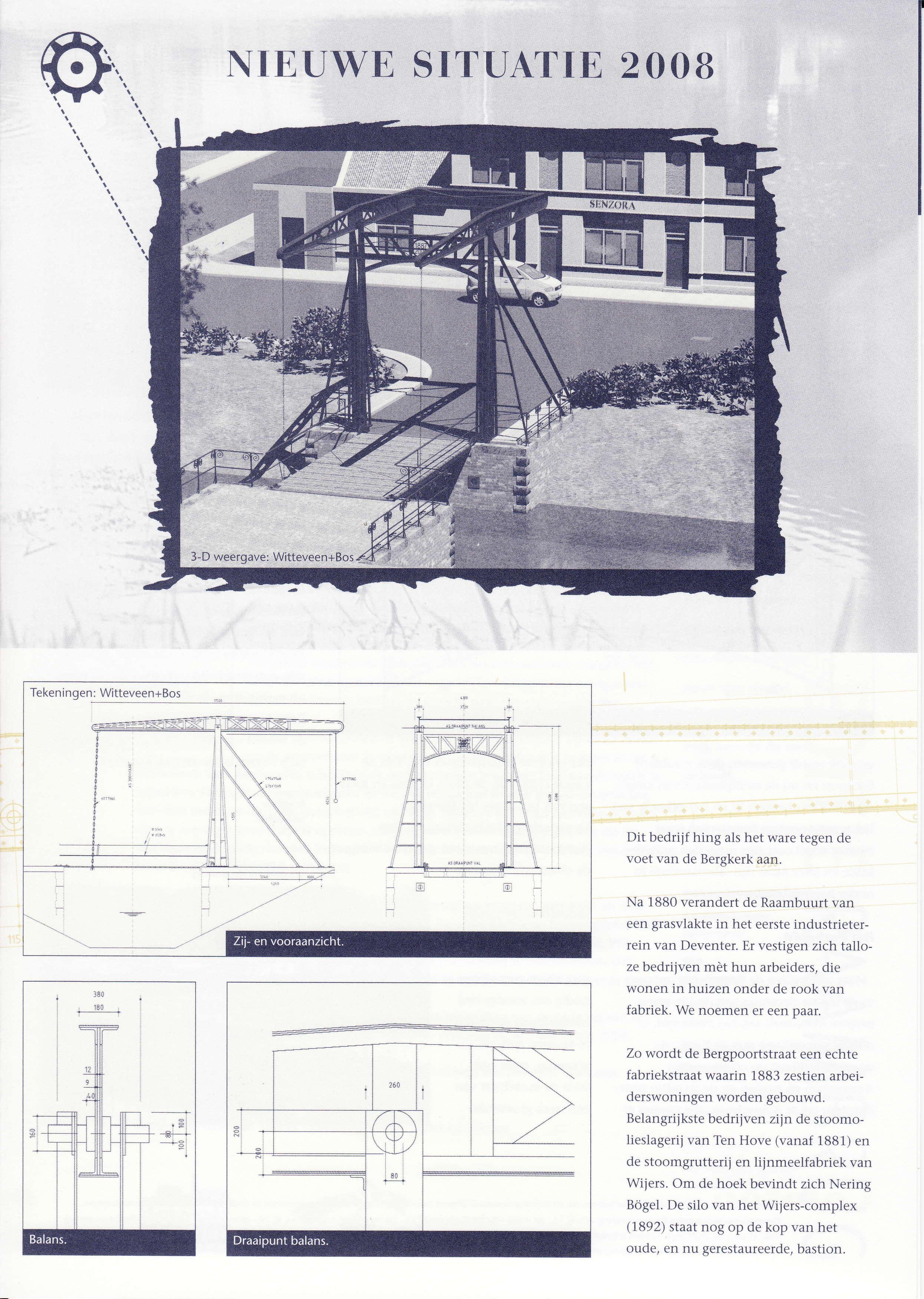 Op dat moment kwam de Stichting Industrieei ErfgoedDeventer (SIED) op de proppen met de wens om een oude brug terug te brengen in dit deel van de stad. Uiteindeliik is beslotende oorspronketijkebrug weer in ziin oude luister te herstellen.Enig spit- en graafwerkdoor de SIEDin het archief leverdetot iedersverrassing het oude bestekop uit 1886, compleet met tekening. Nadat de iets hoger uitvallende financiën in ons eigen Euro-tijdperkopnieuw geregeldwaren, en alle hobbels geslechtdie tot een bouwvergunning moesten leiden, start nu dan echt binnenkort de herbouw van de brug. De kleur: authentiek standrood.