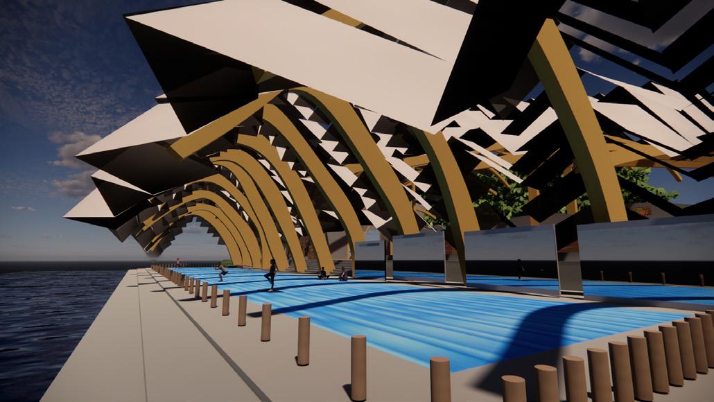 NESTLED IN NATURE, A SILAT SCHOOL, INSPIRED BY BUTTERFLIES, BOASTS A ROOF MIMICKING THEIR SCALES, WELCOMING SUNLIGHT INTO ITS GRACEFUL SPACE. SILAT PRACTITIONERS MIRROR THE BUTTERFLIES’ DANCE, EMBODYING FINESSE AND ARTISTRY. FACING THE RESERVOIR, THEY EXPLORE SILAT’S ARTISTIC SIDE, WHILE COMBAT TRAINING TOWARDS THE TREES REFLECTS THE SWIFT PRECISION OF BUTTERFLY FLIGHT. THIS FUSION OF ARTISTRY AND COMBAT EPITOMIZES HARMONY BETWEEN MAN AND NATURE, WHERE ELEGANCE AND STRENGTH INTERTWINE, AKIN TO BUTTERFLIES IN A SUMMER’S DANCE.