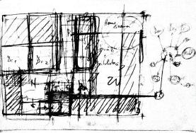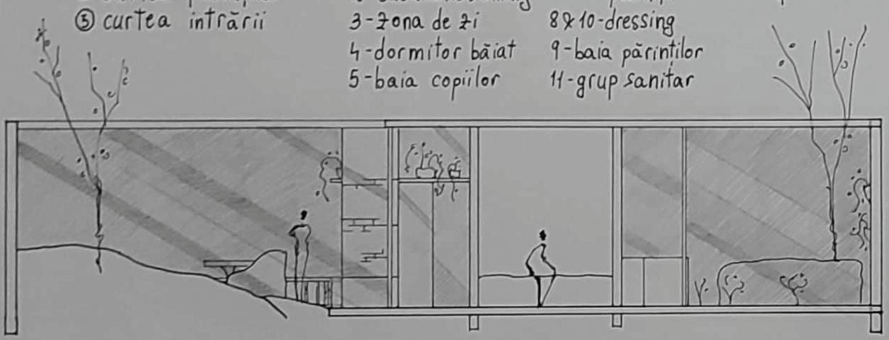 În cadrul acestui proiec t am avu t plăcerea de a mă juca cu lumina în spaţiile casei. Tot în conturarea proiec tului mi-am dezvoltat și primele noţiuni de baza ale arhitecturii, fiind primul proiec t de locuinţa din anul I. Tema de proiec t punea la dispoziţie un dreptunghi de 15mx20m cu trei lături opace, astfel fiind obligaţi să găsim solu ţii de iluminare și ventilare naturală în cadrul acestui spaţiu restrâns.
