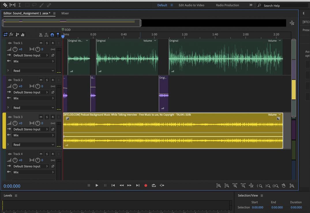 Using Adobe Audition, the sound exercise aims to improve a one-minute interview recording by developing a multitrack clip. This is achieved by incorporating relevant background music that complements the audio. Click on the link below to listen.