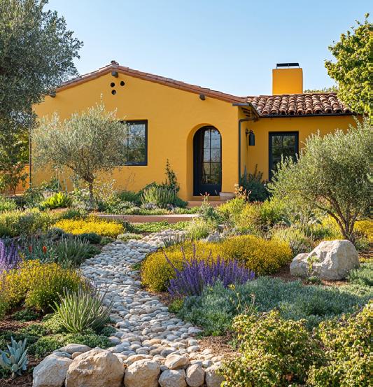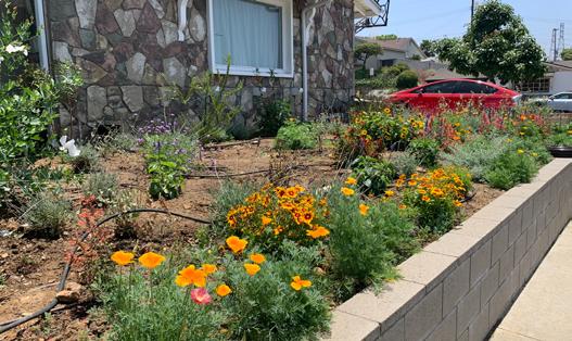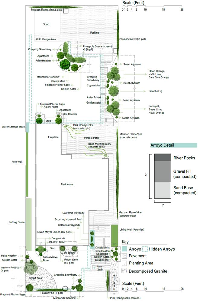 Designed for efficent use of space, budget, and sustainability, this design allows of a sneak peek into a typical Southern California arroyo amidst the hustle of Culver City. The water retention swale collects and pools rainwater toward the orange, lemon, lime, and olive trees on the property. The overflow pours into the parkway, and finally the gutter during large scale rain events.