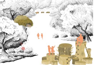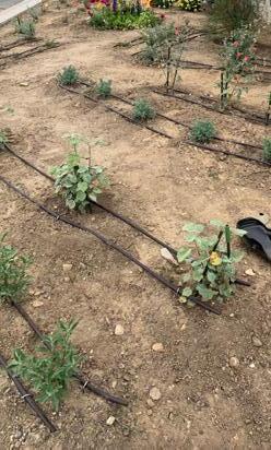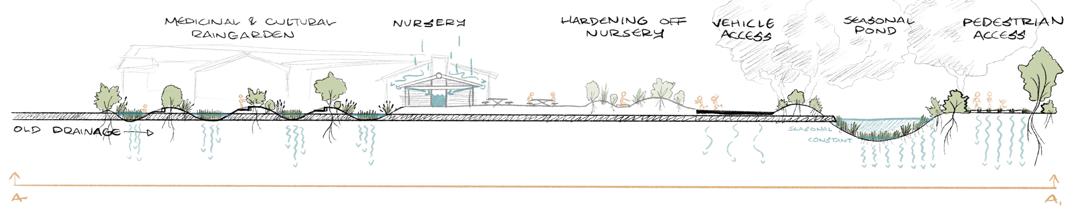 Encouraging the flow of not only water, but also the constant stream of explorative children; these pathways are able to serve multiple purposes while buffering crops. The lack of fencing and guards is purposeful, for the safety and curiosity of the kids that inhabit this space. A small threefoot tall pathway might otherwise be missed by a passing adult, but for a child it can be a gateway to a secret corner of the garden. Various alcoves and branches of the clover paths provide a comfortable, safe, and droughttolerant solution to the previous dusty sand based pathways that originally inhabited this garden. This solution to path definition encourages privacy, creativity, and multi-functional spaces.