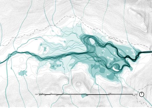 During the analysis phase, this flow map was created to show the different flowrate and pathways of seasonal snowmelt streams, which are sometimes active year-round. This map also shows the flood possibility of the former wet meadows.