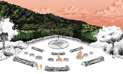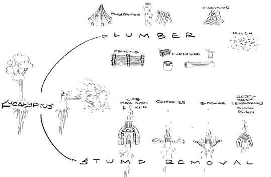 Finding alternative uses for the large grove of eucalyptus on the property allows for unique opportunities for the build form of this design. Cob walls from recycled eucalyptus trees provides a cost-free way to give the tribe privacy and safety.