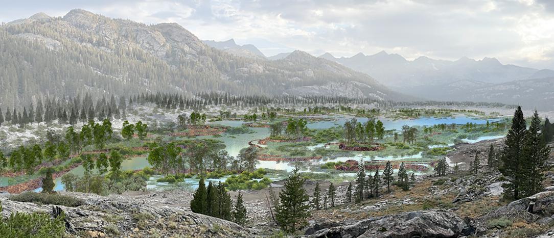 Fully inhabited wet meadows, braided rivers, riparian corridors, and bordering pine forests help to lock in and protect native species on the micro (former ecological islands), and macro (former lakebed) scale. This re-greening process transforms the former barren granite lakebed.