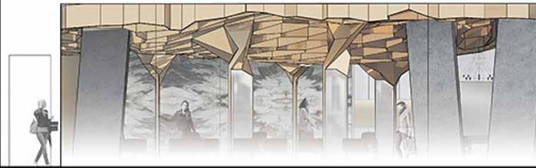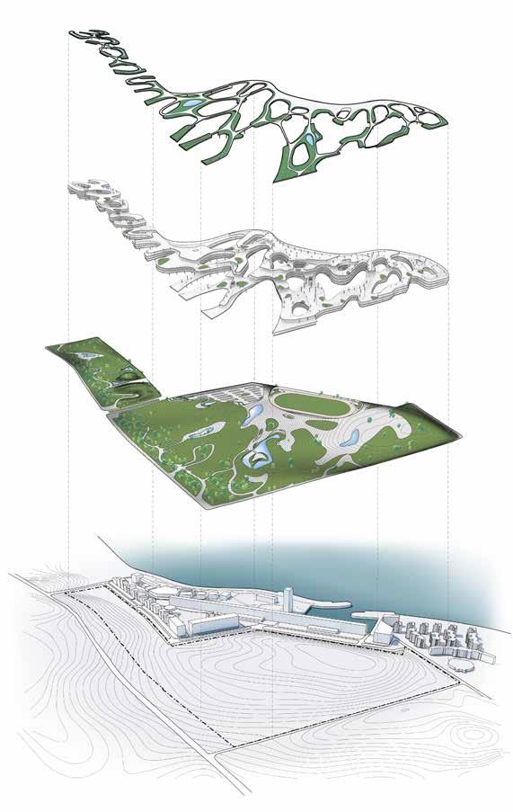 As an active member of the design team, I was able to help in the planning and organization of the new CAFA university campus. This required plotting diferent arrangements of circulation and fnding the most efcient method to create a cohesive space. The campus combined residential, research, lab, classroom, and display programs that emerged from the landscape and escalated to cover a large athletic park. The drawings presented were produced by myself during my time in Beijing while employed at CAA.