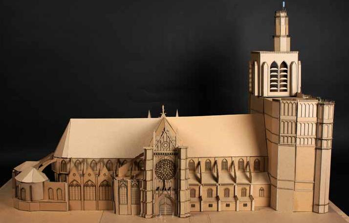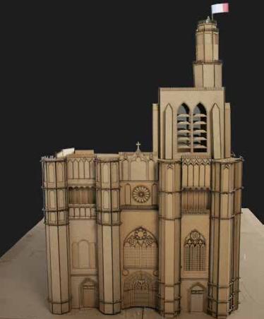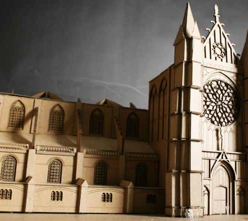 This cathedral was part of a larger project that compared religious buildings throughout the world. Each model featured something unique which was outlined in a concurrent essay. The Sens Cathedral’s was one of the frst cathedrals to be built in the gothic architectural style and featured such elements as fying buttresses and arches that related to the structure and aesthetic. My focus was on the North and South facades that housed the fying buttresses. Based of of internet documentation the facades were drawn into separate cut sheets in Auto CAD, laser cut, and assembled over a period of a couple weeks.