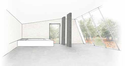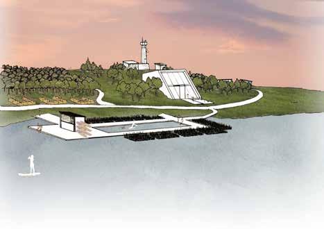 The selected site in Toronto is a man-made landfll site made out of disposed construction materials; and by choosing straw bales as a building material I saw an opportunity to revitalize the land. The site is comprised of three buildings, a spa, a café, and a residential/studio space for four select artists. By creating a timeline for the site, it was possible to plant and harvest wheat straw bales and use them not only as a building material, but as a fertilizer for a residential and café vegetable garden, soil enrichment for the trees in the sculpture garden, and for the orchard. This strategy allows for a sustainable ecosystem and provides year-round jobs. Having the bales on site, it allows for any potential future growth or addition of buildings as the users require. These bales are also a key feature of the architecture and ac cented throughout the buildings as seating in the residential units and shelves in the studio space. The concurrent technical report for this project outlines the use of rainwater collection systems in each building and the closed loop water systems that draw water in from Lake Ontario to heat and cool the buildings. This project sparked an interest in sustainable sites and how to combine water conservation concepts.