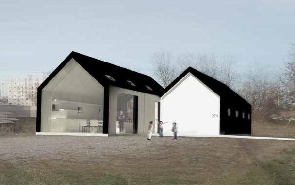 Created for a competition submission, the goal was to use vinyl paneling in an innovative economical manner. By creating prefabricated modules with a variety of enclosed, window, and door openings to the basic house shape it allowed for a fexible and adaptive design strategy. The unit adapts to the individual owners through changing the order in which the modules are placed, creating either more open or private spaces. The curved skylights and foor to ceiling windows allow for natural lighting. The radiant foor system is an active solar design that uses recycled water in to heat the living space.