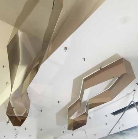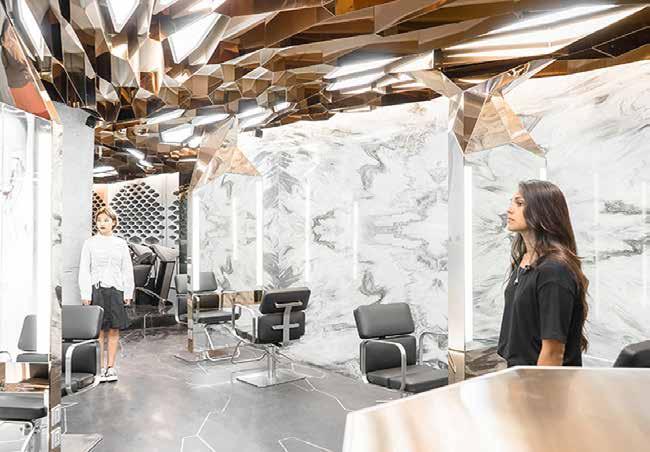 MQ Studio is a unique upscale hair salon that required an open concept plan, with discrete storage and a private chair for exclusive clients. The client wanted their studio to refect their creative nature and display their artistic creations. The ceiling modules are created to resemble a golden fowing river that extends below to frame double sided mirrors. The ceiling is not only for decorative purpose, but to discreetly tuck away the change in ceiling height and house lighting fxtures. This major element is subtly refected in the foor details with gold stripping.