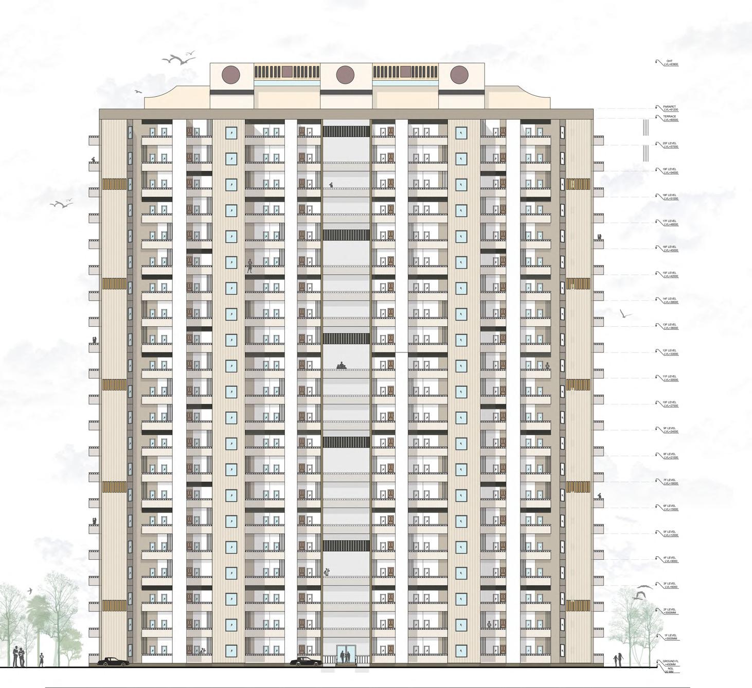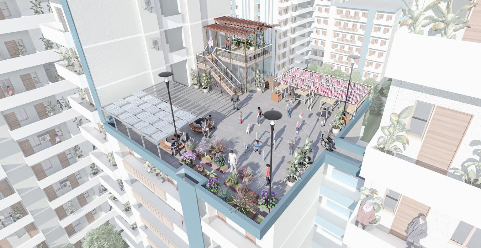 High-level terraces, shared among multiple floors, fulfill social needs for distant residents. Collectively owned and available for events, they provide dedicated communal spaces amidst elevated living environments.