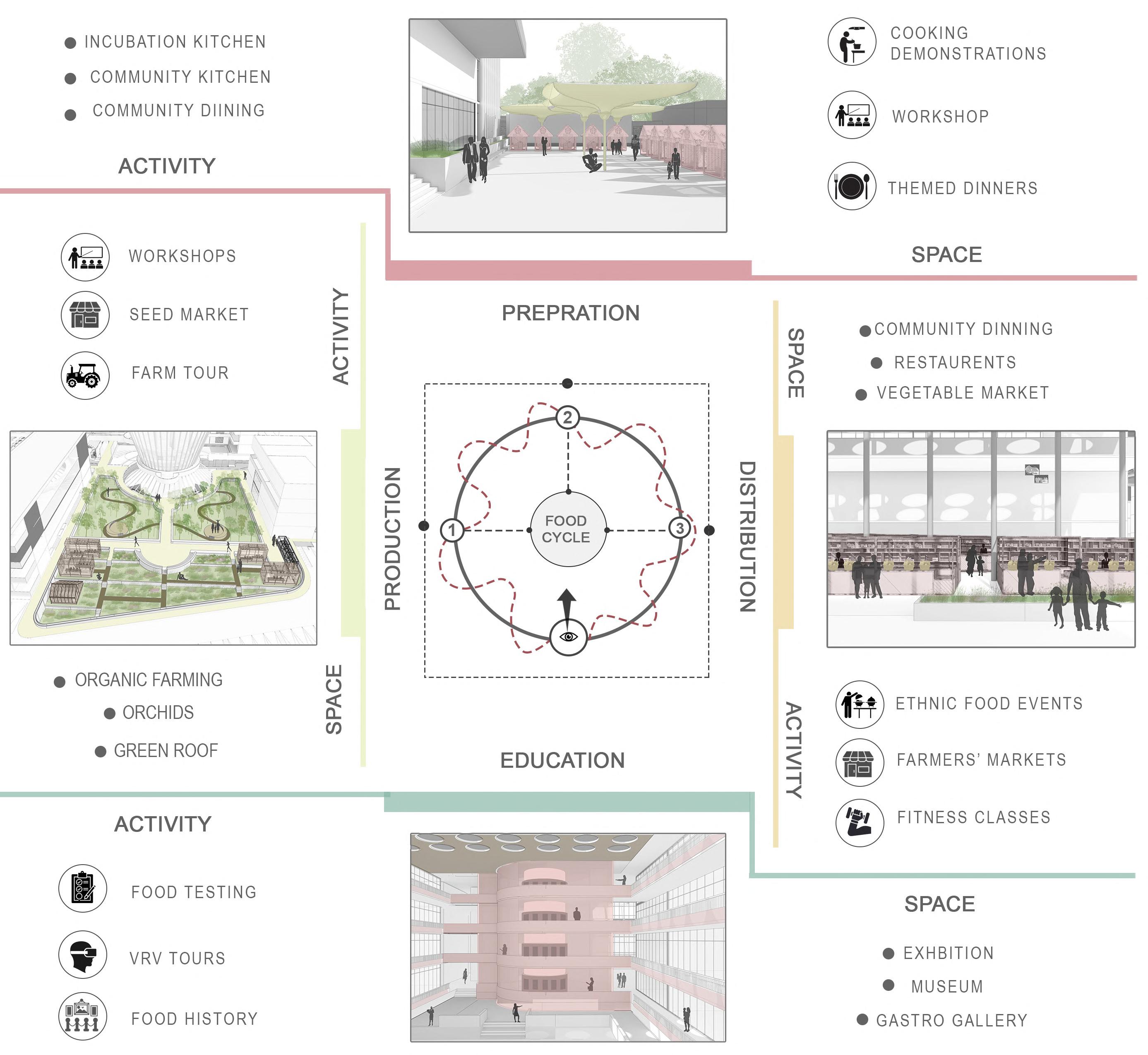 An Urban Food Hub in India is a vibrant community space where local food is grown and shared. This thesis explores sustainable architectural design that supports local farmers, celebrates cultural diversity, enhances urban food security and community well-being.