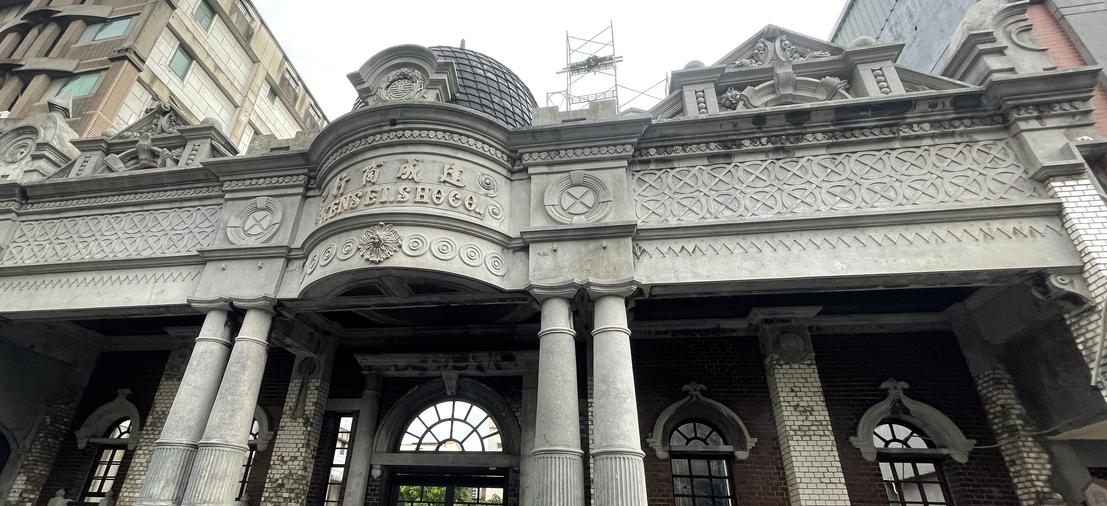 為「折衷樣式」鋼筋混凝⼟建 築。建築⽴⾯貼溝⾯磚,最上