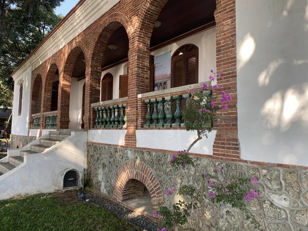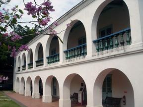 廊以綠釉瓶飾欄杆並刷上⽩⾊ 的粉牆,鮮豔的顏⾊不同於安 平傳統的建築。具正⾯主樓 梯、三⾯拱廊、⽊桁架及舖⽡ ⼆層。