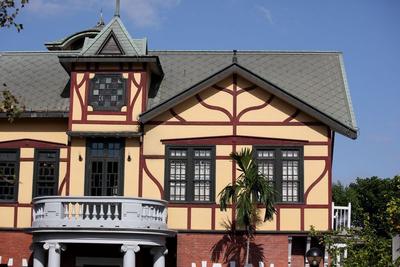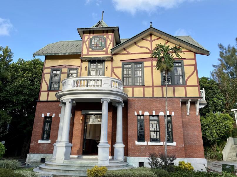建築整體仿諾⽿曼莊園主宅邸, 屋架為⼗九世紀新古典主義發揚 的都鐸式建築。⼀樓使⽤臺灣煉 ⽡磚與撒⽊⽿煉⽡會社磚作為承 重牆,⼆樓外牆採⿈、⽩、紅三 對⽐⾊系,梁柱裸露在牆外,並 刻意變化作成樹枝狀。閣樓上有 綠、⿈、紅三⾊彩繪玻璃。