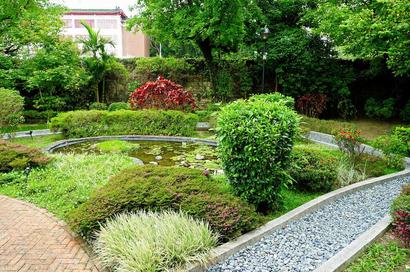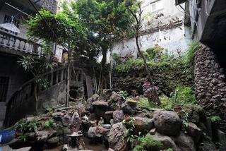 ⽴⾯磚砌,貼覆不同花⾊⾺賽克磚,內部保留公媽廳、辦公室及 原有⼤⾨。後院花園以雙層迴廊圍繖⽔池造景的⽅式設計,設置 旋轉梯連通上下層,主要的建材採⽤⾦⼭萬⾥所採集的咾咕⽯。