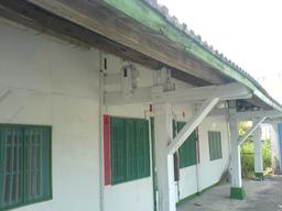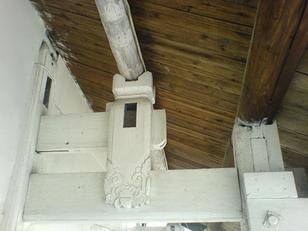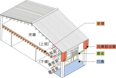 壽樑:傳統店屋在前柱頂端出挑的部 分,⼾⼾以圓形杉⽊的壽梁連貫,將沿 街的騎樓緊結為⼀體,以增強對地震的 抗震⼒。