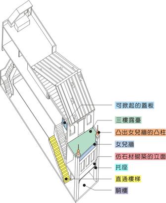 從騎樓直接通往⼆樓的樓梯,區隔 樓店⾯ 空間與⼆樓⾃宅空間。