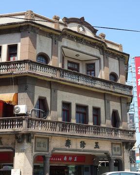 ⽟珍齋是⼀棟裝飾主義⾵格的建 築,⼀樓⽴⾯書有「⽟珍齋」及 「登錄」、「商號」,是⿅港書 法家陳浚源的墨跡。