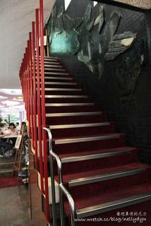 通往⼆、三樓之混擬⼟樓梯應是1947年 室內裝修後的成果,以懸壁⽅式固定於 牆體,形成特殊的透空效果。