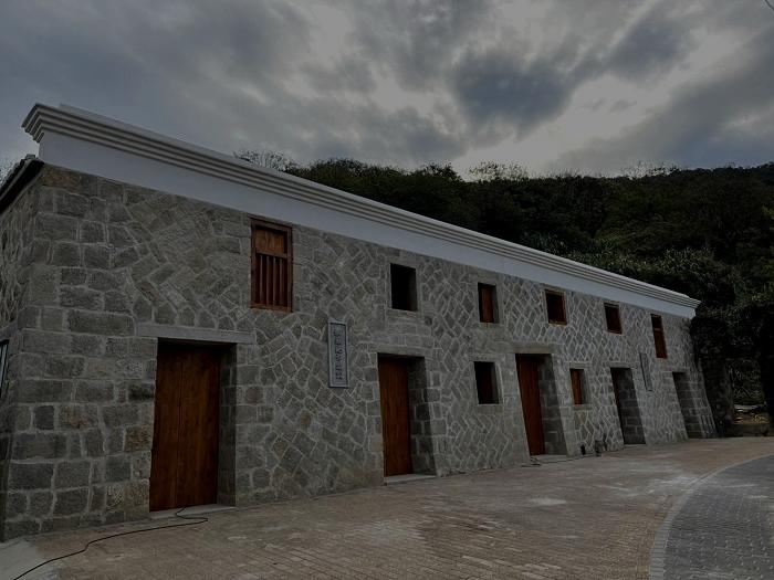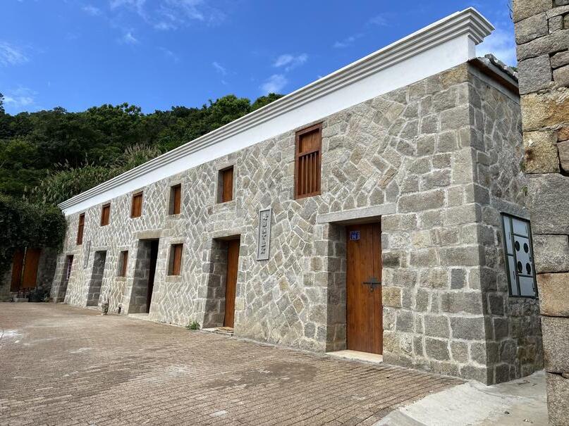 五間排為閩東⾵格的建築,也是 住家和營業場所的複合式建築, 是北竿唯⼀⼋扇⼤量體的建築, 屋前設有⽯敢當避邪,⾨楣上運 ⽤⽯砌造出蓮花紋樣的牆⾯裝 飾,建材上有⽯砌、⼟磚、灰 磚、夯⼟、⽊構、編⽵泥牆等多 元素材、多層次的運⽤。