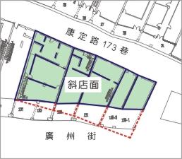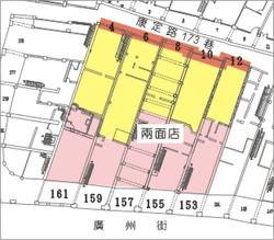 ⽇治時代都市計畫道路開闢後,部分建築將空間格局以⼀牆之隔分為前 後⼆個店⾯,中間以天井相連,形成⼀個⾯向廣州街、⼀個⾯向⽼街的
