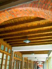 材質搭配幾何圖形;結構則為 承重磚牆與擱檁式樓板及屋架 所構成。