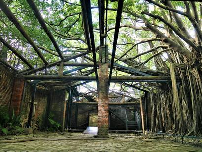 洋⾏建築後⾯是平房倉庫,經 百餘年歲⽉滄桑後,倉庫牆⾯ 滿佈榕樹盤據的氣根,形成 「安平樹屋」。