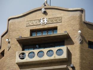 窗處有圓拱造型,⼥兒牆由簡 單幾何元素構成,並鑲有琉璃 花磚。