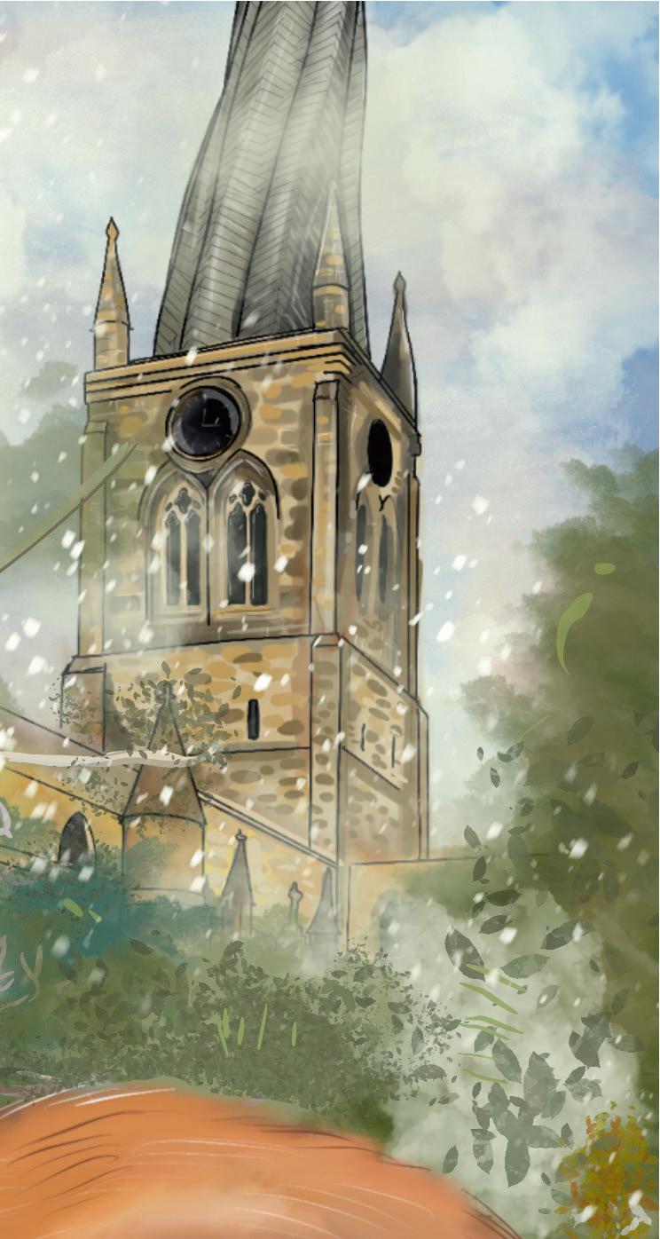 "For my cover art I was inspired by me and my grandparents watching foxes through the window when I was little, and overhearing someone say 'the spire saw me come into this world and it’ll see me out' in a gruff Derbyshire accent on my way through town one Saturday morning. The landmark is sheltering the cub from driving snow; a piece that I hope will make people smile, or at least 'awww', even if it’s internally.