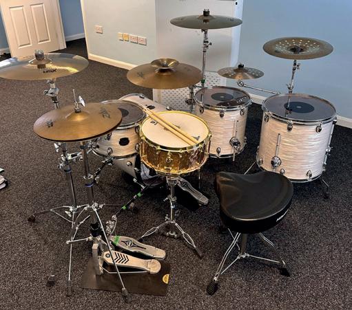 Tour - White Marine. 22” Kick, 12”, 14”, 16” Toms - Very good condition, rare colour. Worldmax Vintage Classic Brass 14” Snare. Collection of cymbals, no cracks. Including throne, pedals, all stands. Available to view. Can deliver on request.