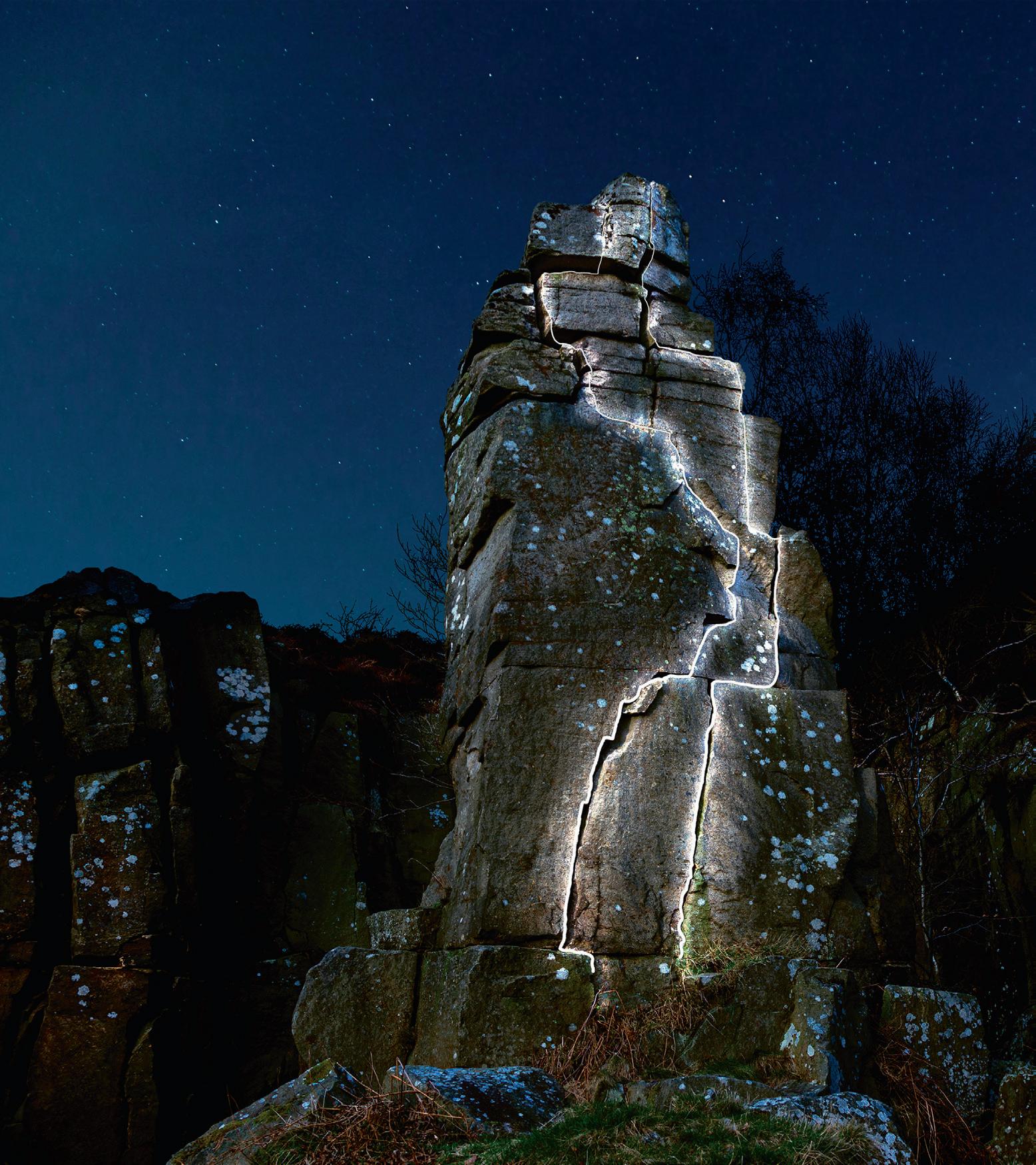 Her first attempts took her to Burbage, where she illuminated rock faces with nothing more than her father’s head torches. Today, she still relies on a simple mix of head torches, bike lights, fairy lights and, when it cooperates, the moon.