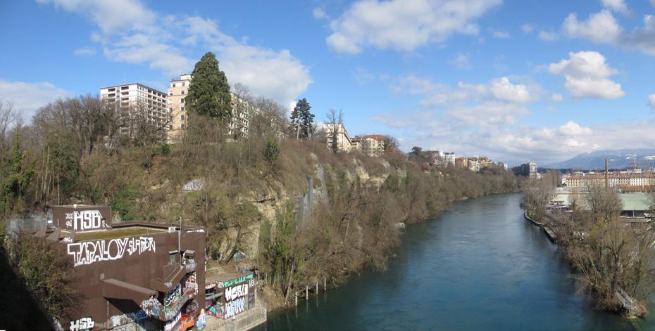 L’identité même du site est marquée par l’hydrogra phie. La jonction du Rhône et de l’Arve, le mélange de leurs eaux, est l’événement majeur qui a donné son nom à cette partie du territoire. Au nord, il y a le fleuve bleu vert transparent, le Rhône, qui a eu le temps de décanter dans le Lac Léman, au sud, la rivière qui vient directement de la montagne, l’Arve, froide et verte-grise à cause des matières en suspension. Le débit du Rhône est contrôlé grâce au barrage du Seujet, contrairement à l’Arve qui connaît beaucoup plus de variations.
