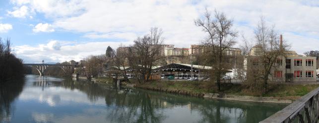 La situation est radicalement différente le long du Rhône. Où anciennement se trouvaient des saules, des peupliers ont été plantés en enfilade, structu rant visuellement la rive.