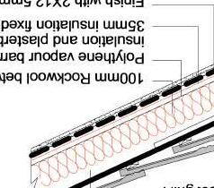 TYVEK SUPRO fully breathable roofing felt on timber as specified by Structural Engineer - refer to drawings. Pitched roof (sloping roof) to be insulated, provide 100mm thick CELOTEX GA4000 insulation between rafters and 35mm fixed underneath rafters. Fix polythene (1000 gauge), vapour control layer including air leakage (permable underlay) barrier with 2x12.5mm plasterboard with 3mm plaster skim Achieves 0.18W/m²K.