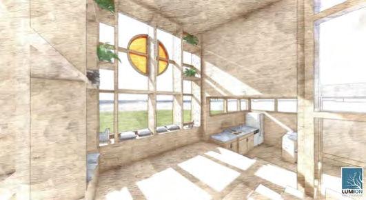 On the site there is five major community attractions. Down on the East end there is a restaurant which has indoor and outdoor seating with a view so that it may act as a lure to have more foot traffic in the area. All skinny home styled units have storefronts on the bottom level so the co-housing complex can behave more like a village then a dwelling.
