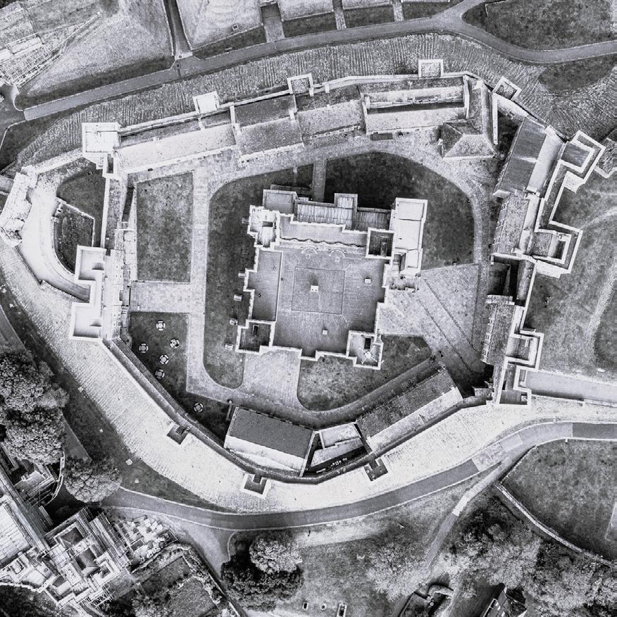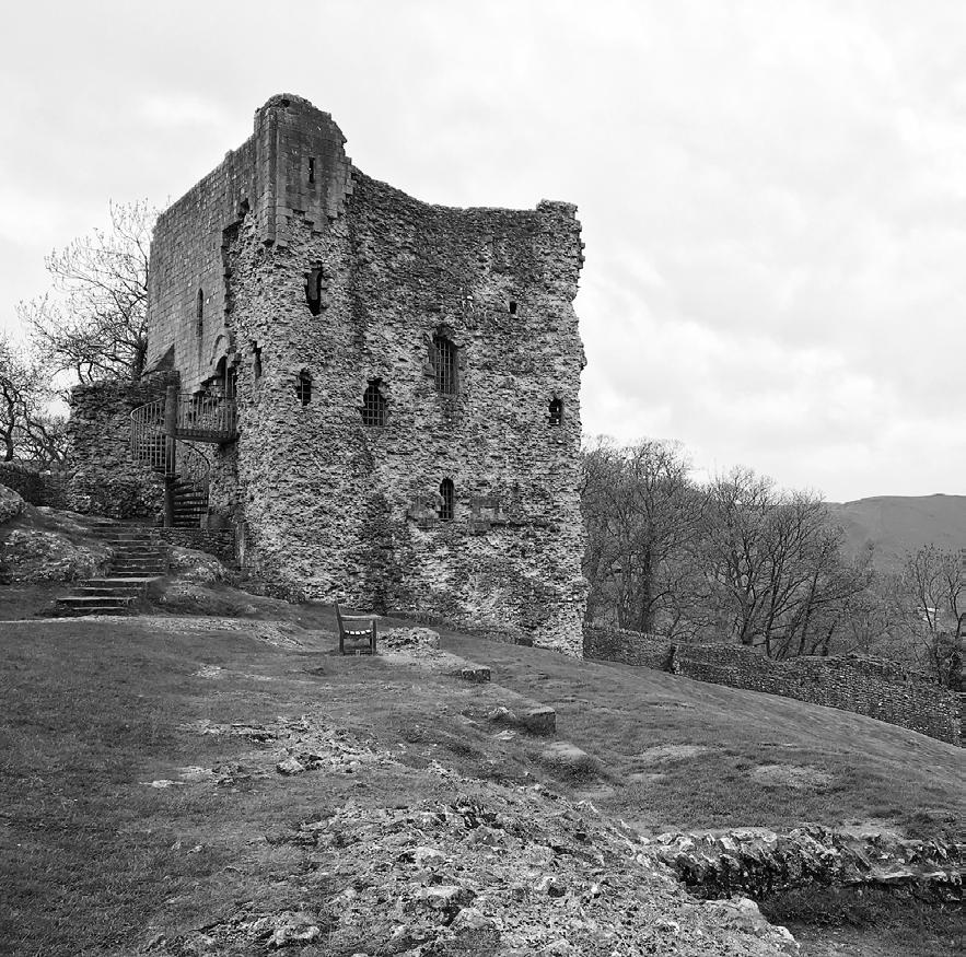 Peak Castle is located in Durbyshire, England, at the top of a steep valley. The main town is located nearby and is overlooked by Peak castle providing a sense of protection The castle uses its site to its advantage by locating the square keep in the far corner. The plan portrays a sense of pure geometry within its dense, heavy walls. Small openings in the facade conceal the vast interior void that is found at the center of