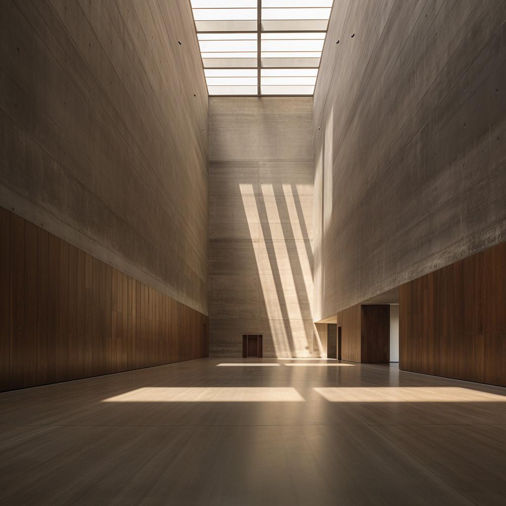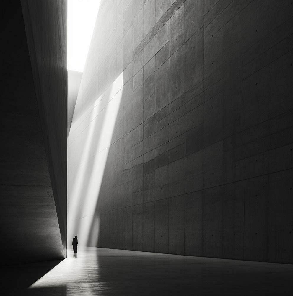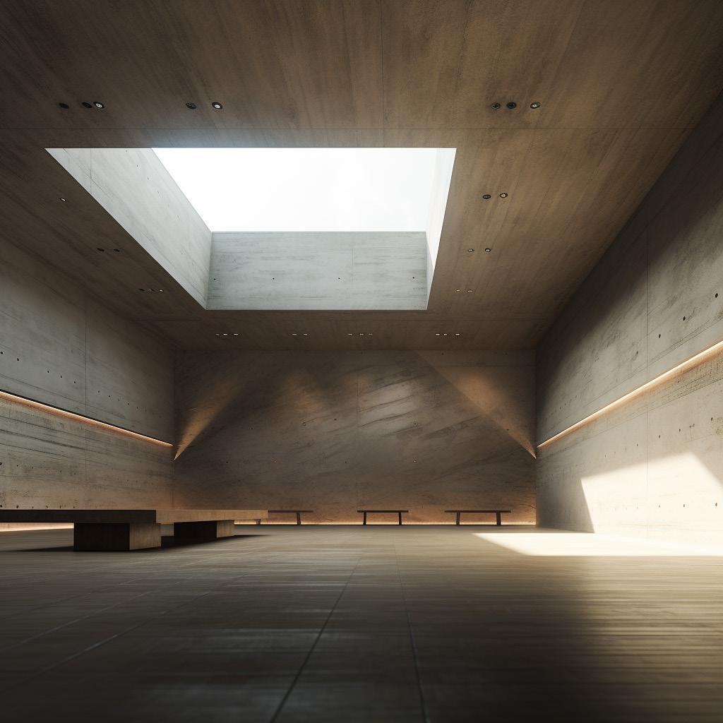 From the beginning, I wanted to convey the ideas of heavy monolithic architecture through the use of heavy massing of thick walls and ceilings. I wanted users to have unique and dramatic encounters with light. The goal of my AI images was to elicit the feelings of intrigue relating to the