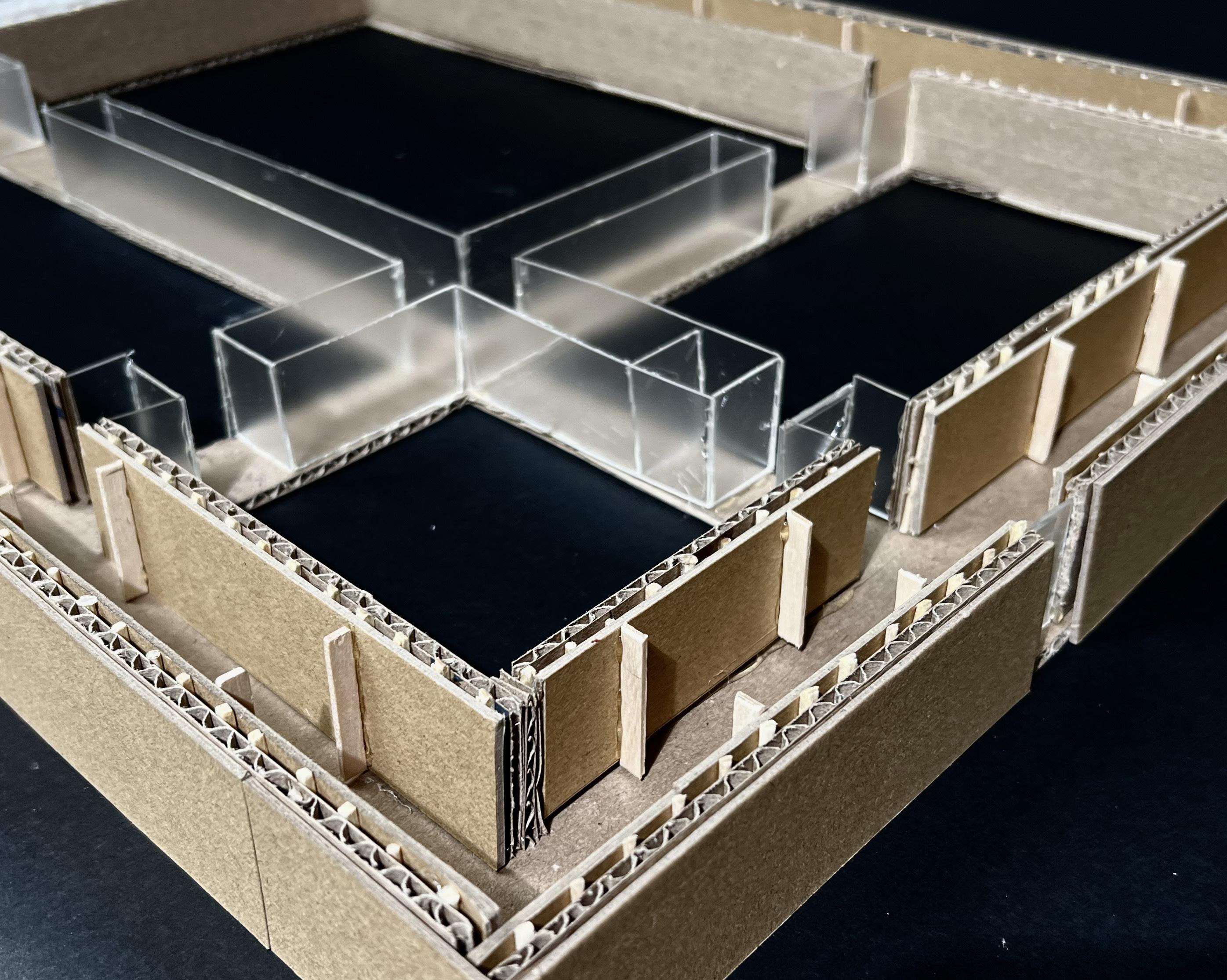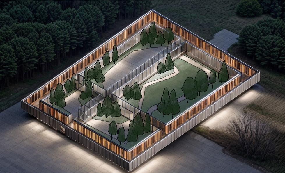 As the perimeter houses the art and work produced by the residents, the cross acts as the living area. Surrounded by four courtyards that change in size and purpose, the building forms a world of it’s own, open to interpretation, and ever changing.