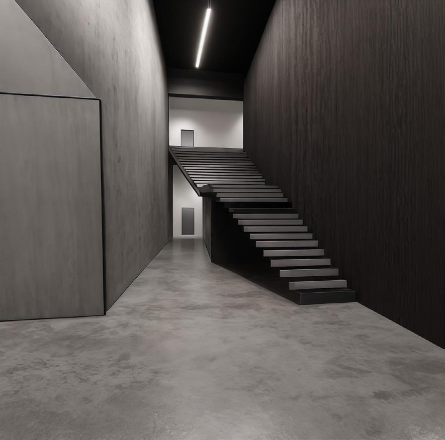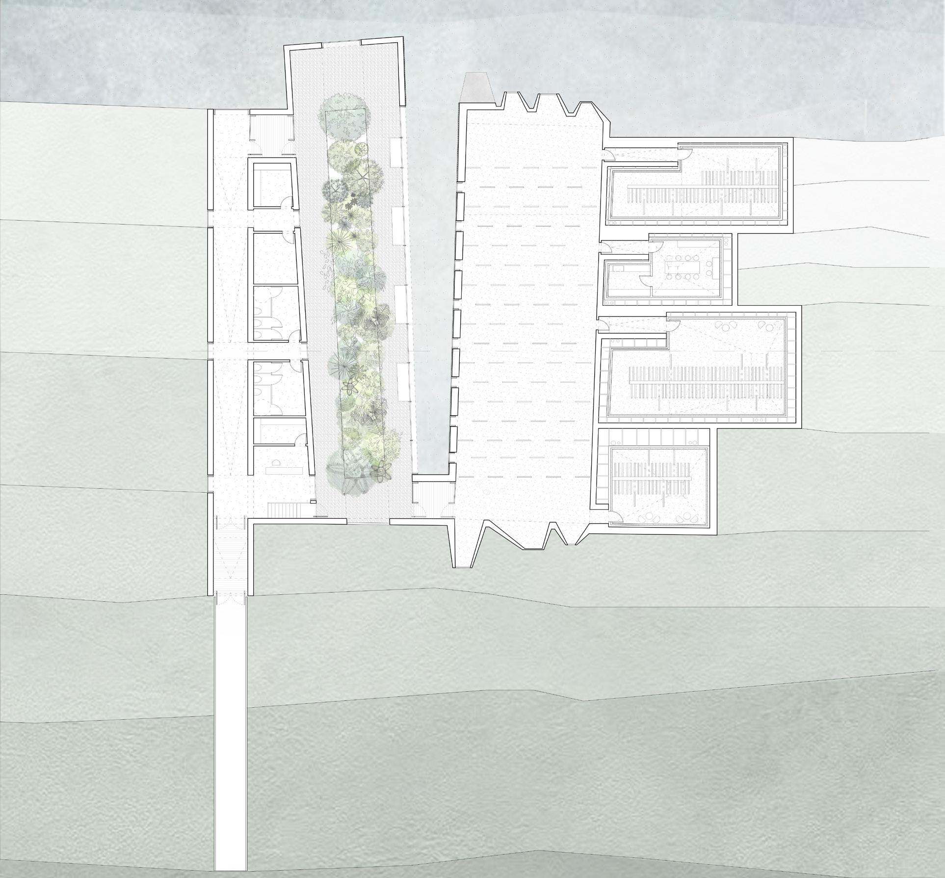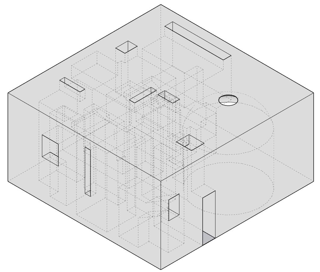 The building itself is monolithic in nature retaining the idea of heavy construction. There is myriad of intentional dramatic light encounters that patrons will experience. The rooms are all interconnected. The idea that the interior is not discernible by looking from the exterior is carefully planned, so as the experience of the space requires the user to explore inward.