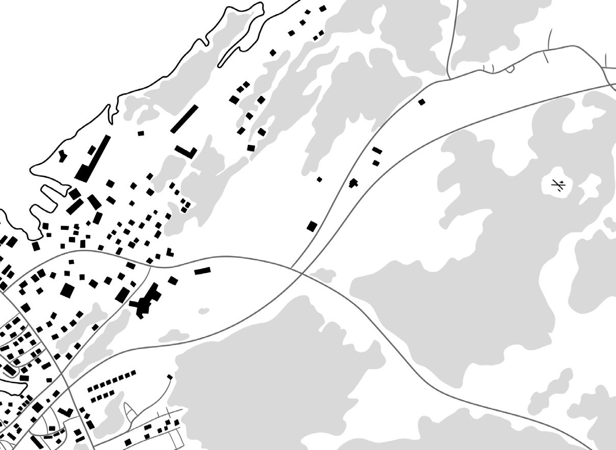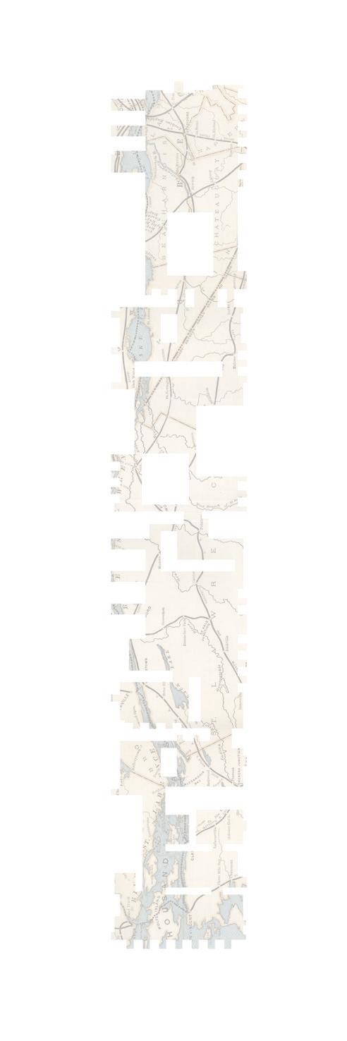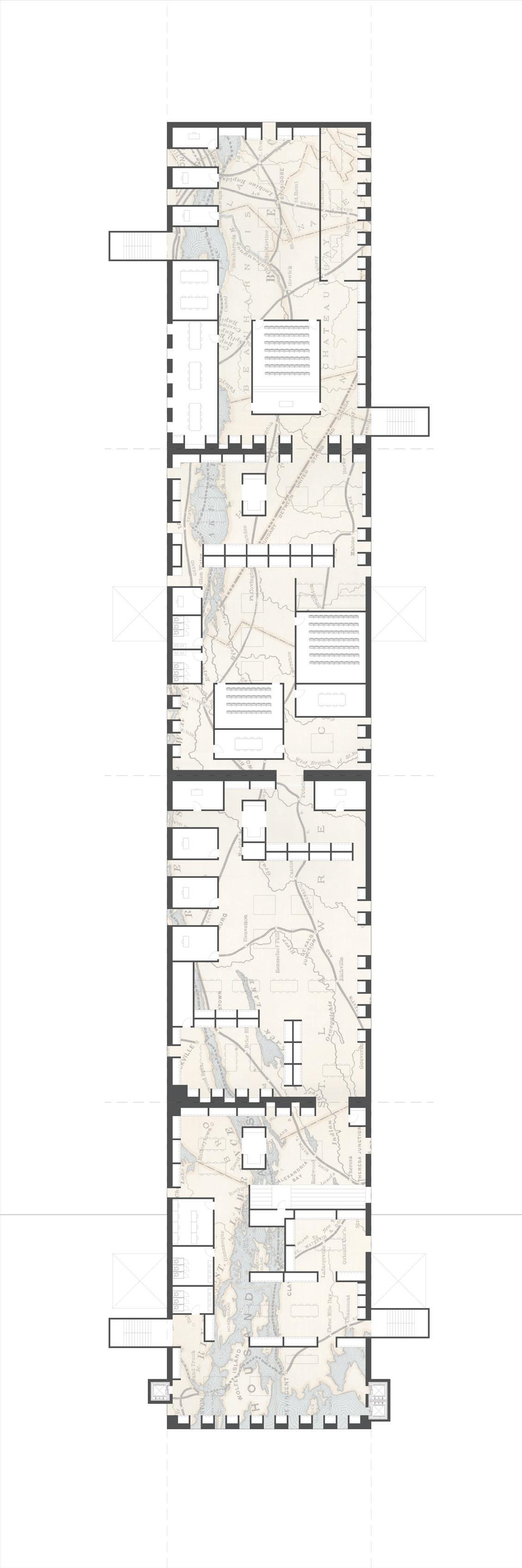 the bridge. Within the structure, there would be collections of world maps of all sizes, era, time period, etc. There are large tables and walls to hang or drape the maps over for viewing. There is a map engraved on the floor showing the topography, streets, landforms, islands, and river below the building of the Thousand Island region and surrounding areas. This map shows the positive space of the building for the main path of circulation and use of the public will occur. The underside of the building references Lewis Carroll’s “Ocean Chart” or “Snark Map”, but with a mirror instead of a blank drawing. Boaters below the bridge will see a reflection of themselves and the water when looking above them. For the future of this design, more modules could be added to have the building stretch across the entirety of the suspension bridge.