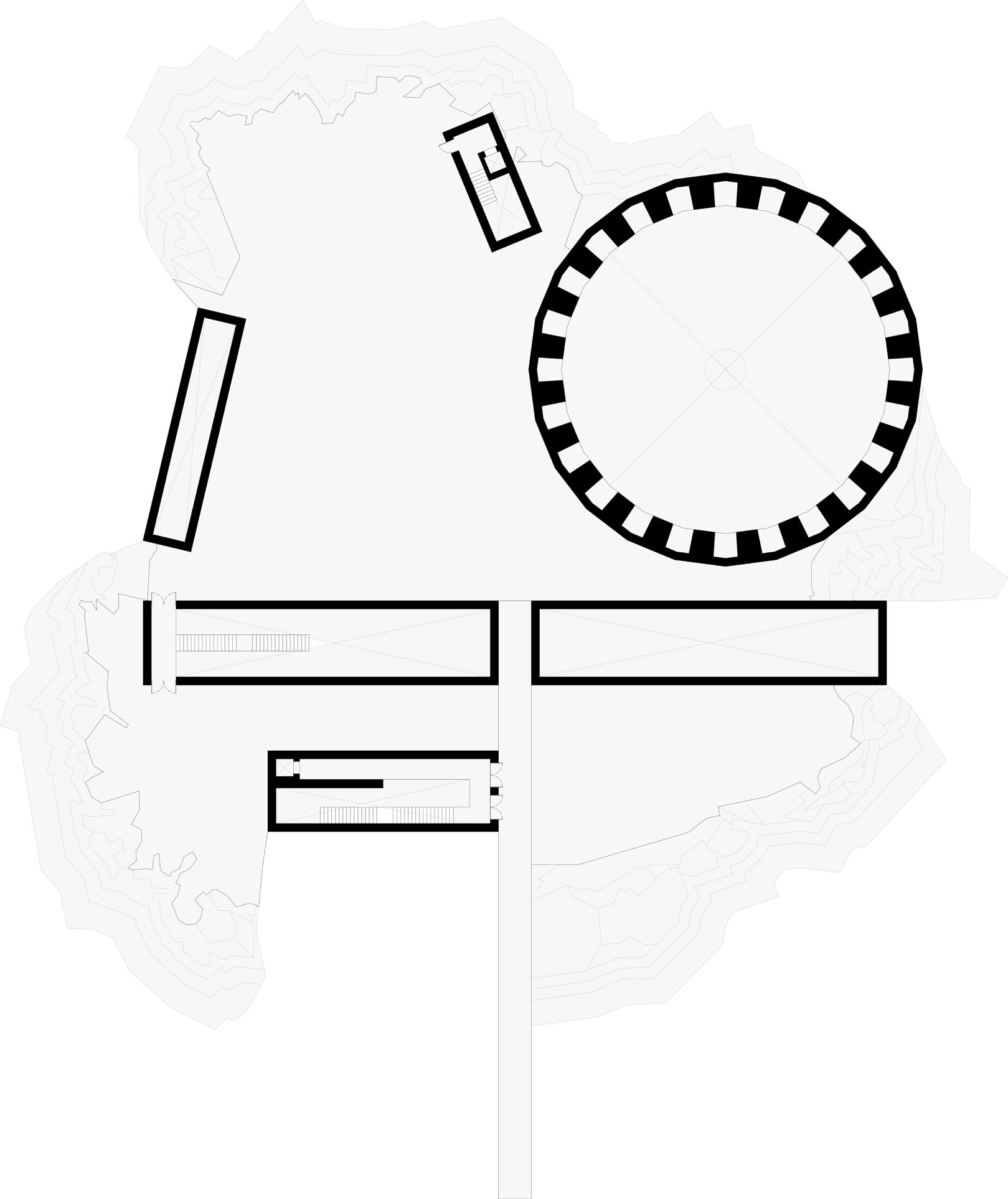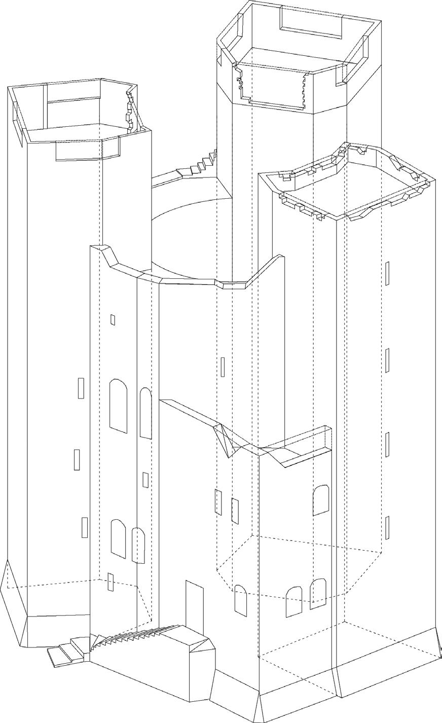 the castle. Secondary elements surround the central void and serve as support spaces and elements of circulation.