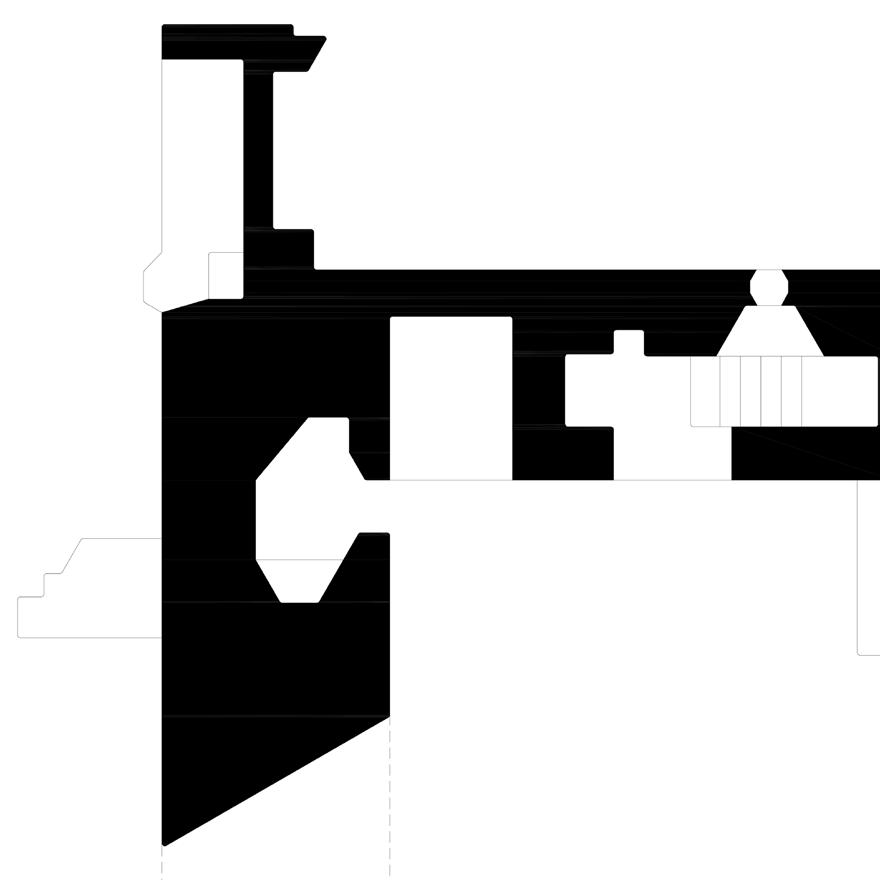 The indent along the West facade also plays a role in establishing this diagonal line in the geometric drawing. Where the line meets the top right corner is the only spot in the whole drawing where two members meet.