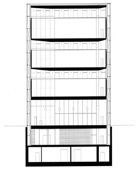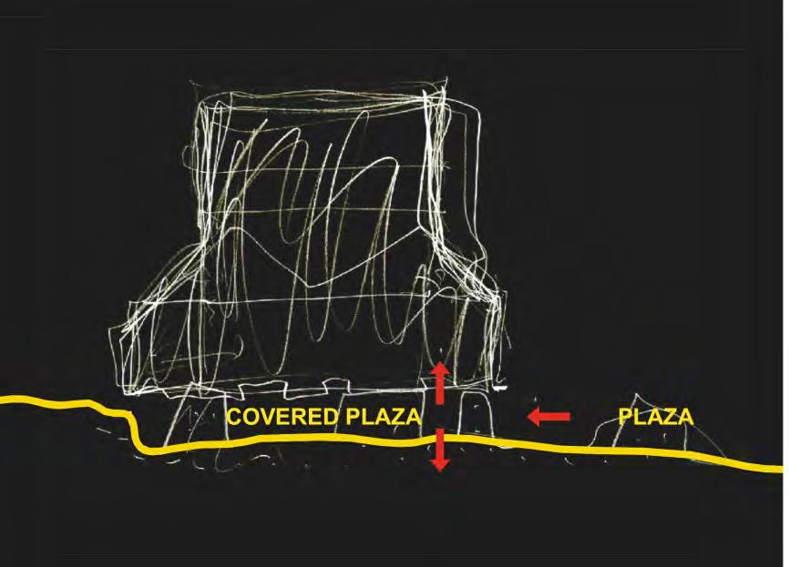The Site section below is used to show the topographical relationship to the new structure being proposed. However the farthest building to the left, along with the tall tower and the building directly to the right of that are all existing. So we begin to see a gradual step with the ground plan. This allows me to excavate and have portion of the basement underground.