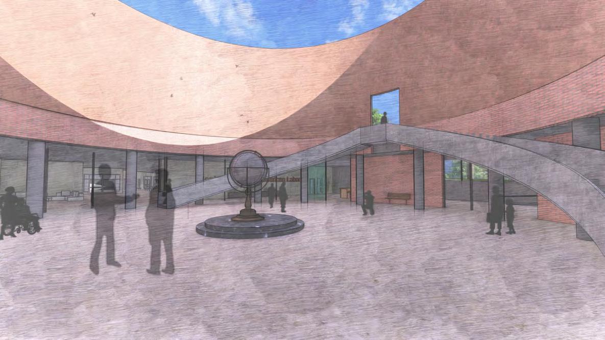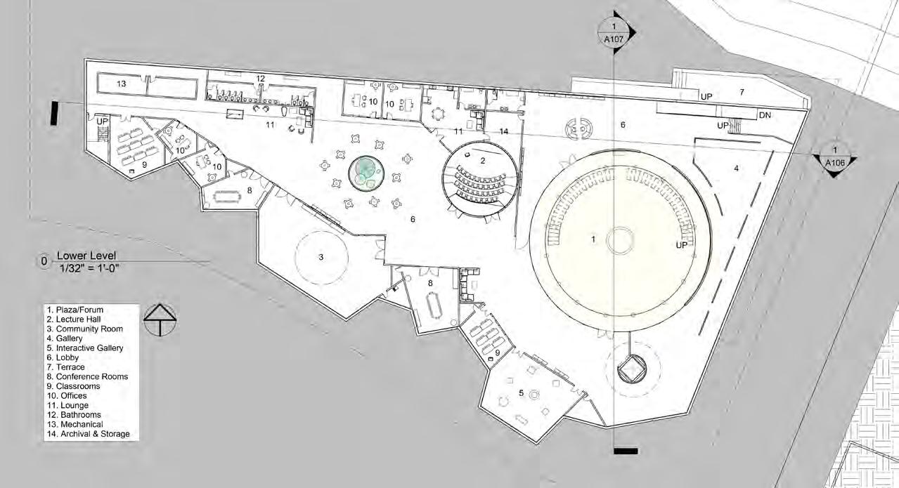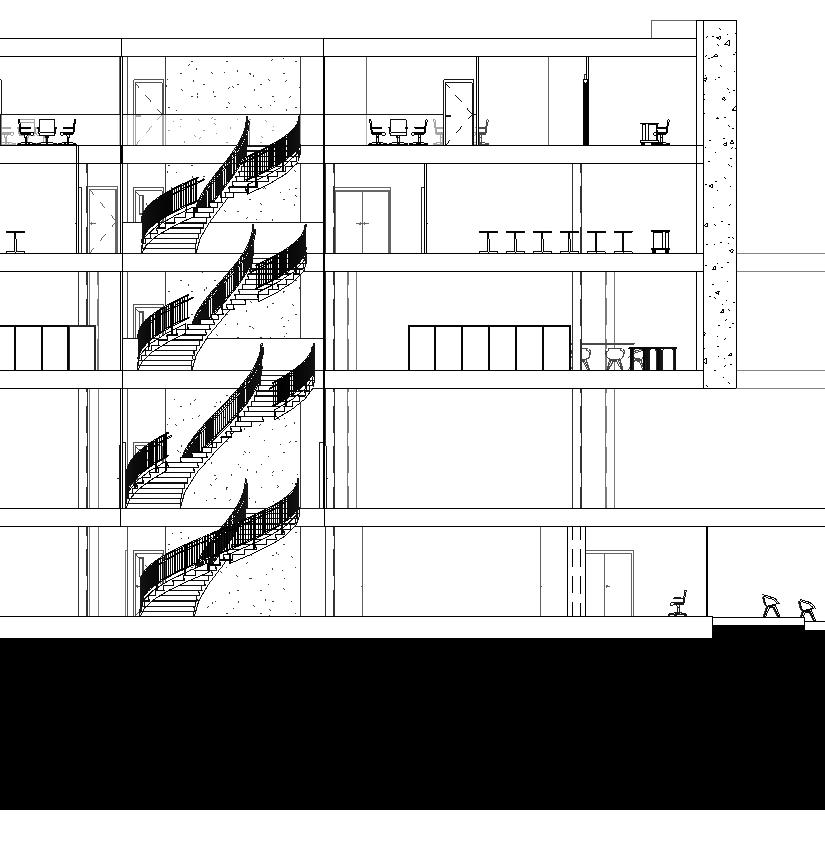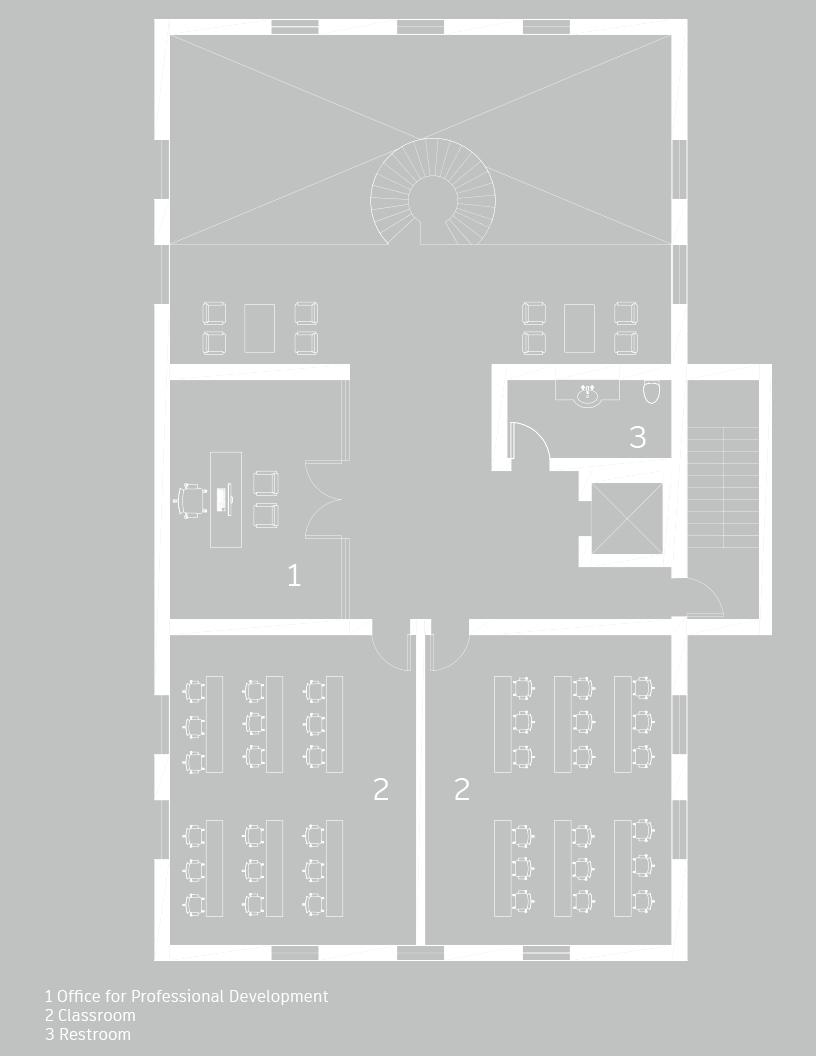 When designing the program, I understood there needed to be classrooms, offices and meetings rooms that require a little more privacy regarding spatial organizing. In other words, I placed all the programmatic spaces that require dedicated users like students or researchers above this ground floor plan that consist of the lobby space. The beautiful semi circular staircase is embedded into the open atrium allowing light to travel into every floor.