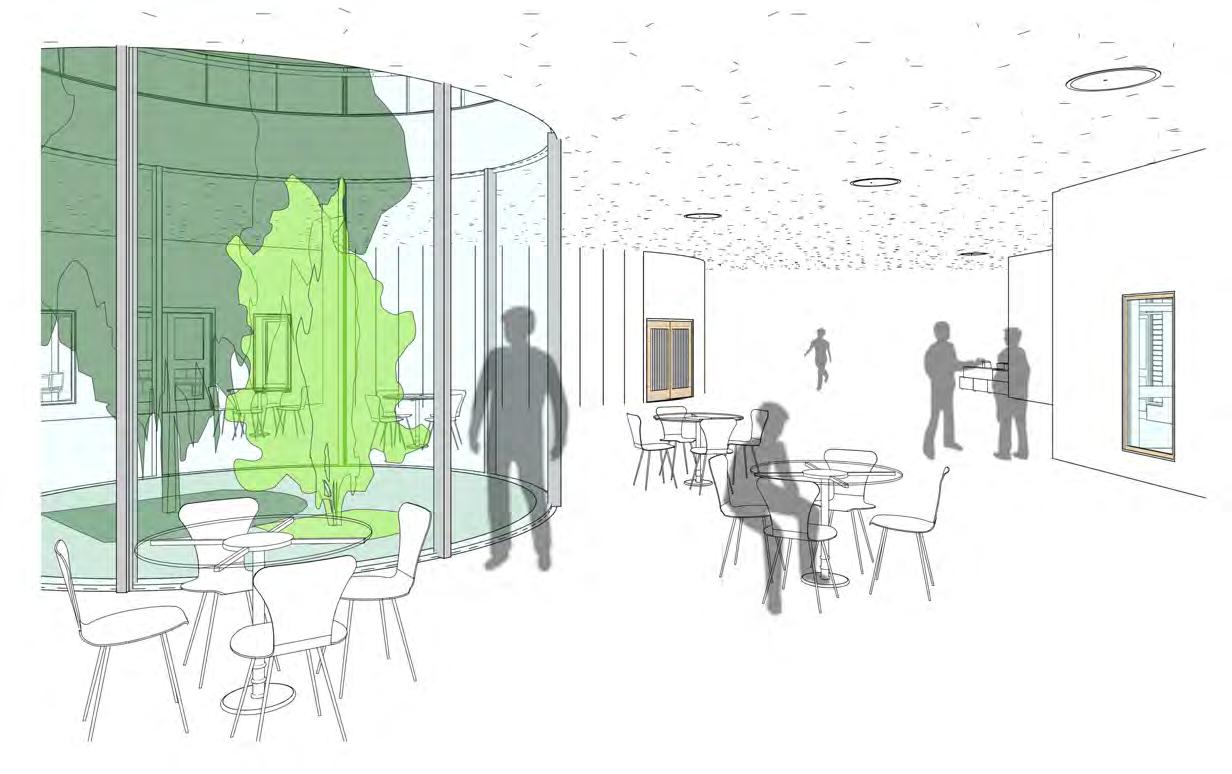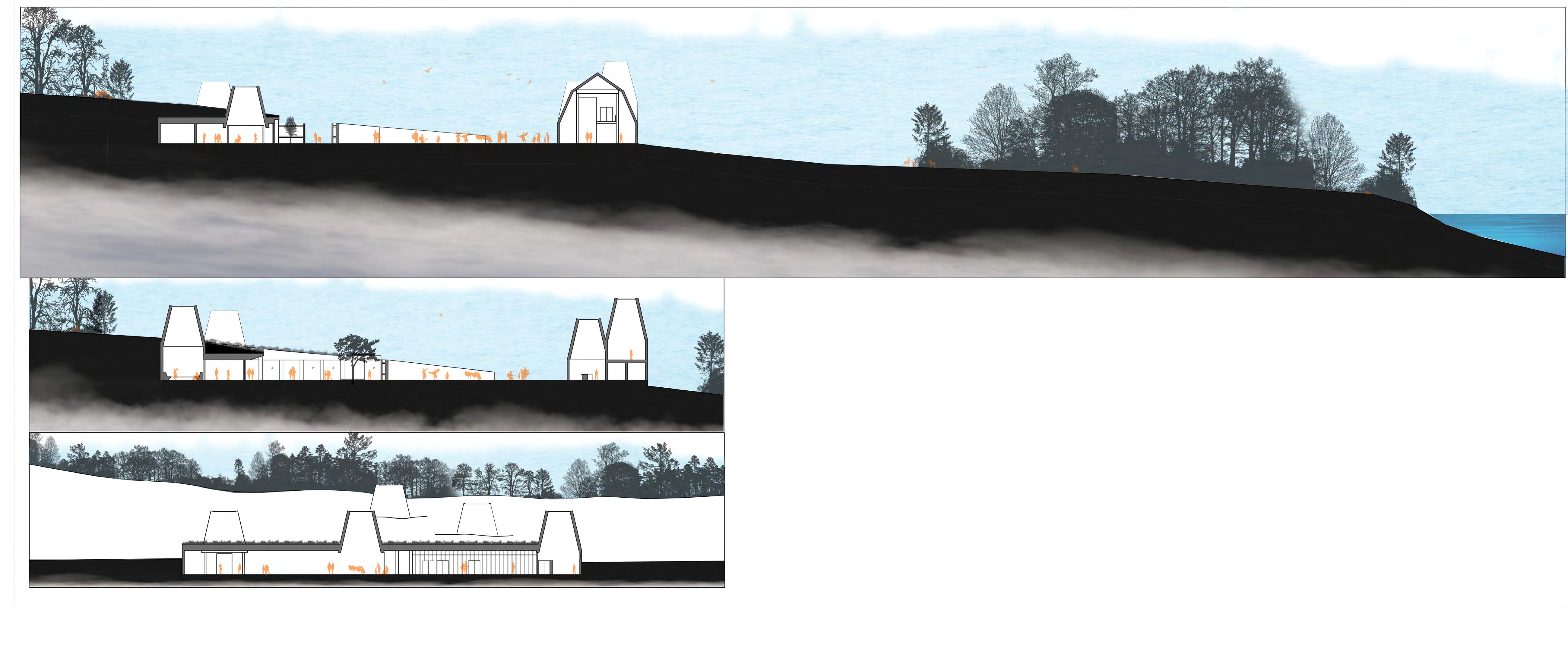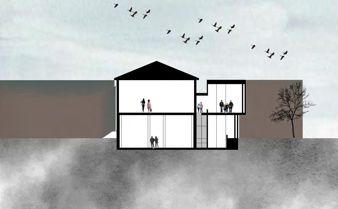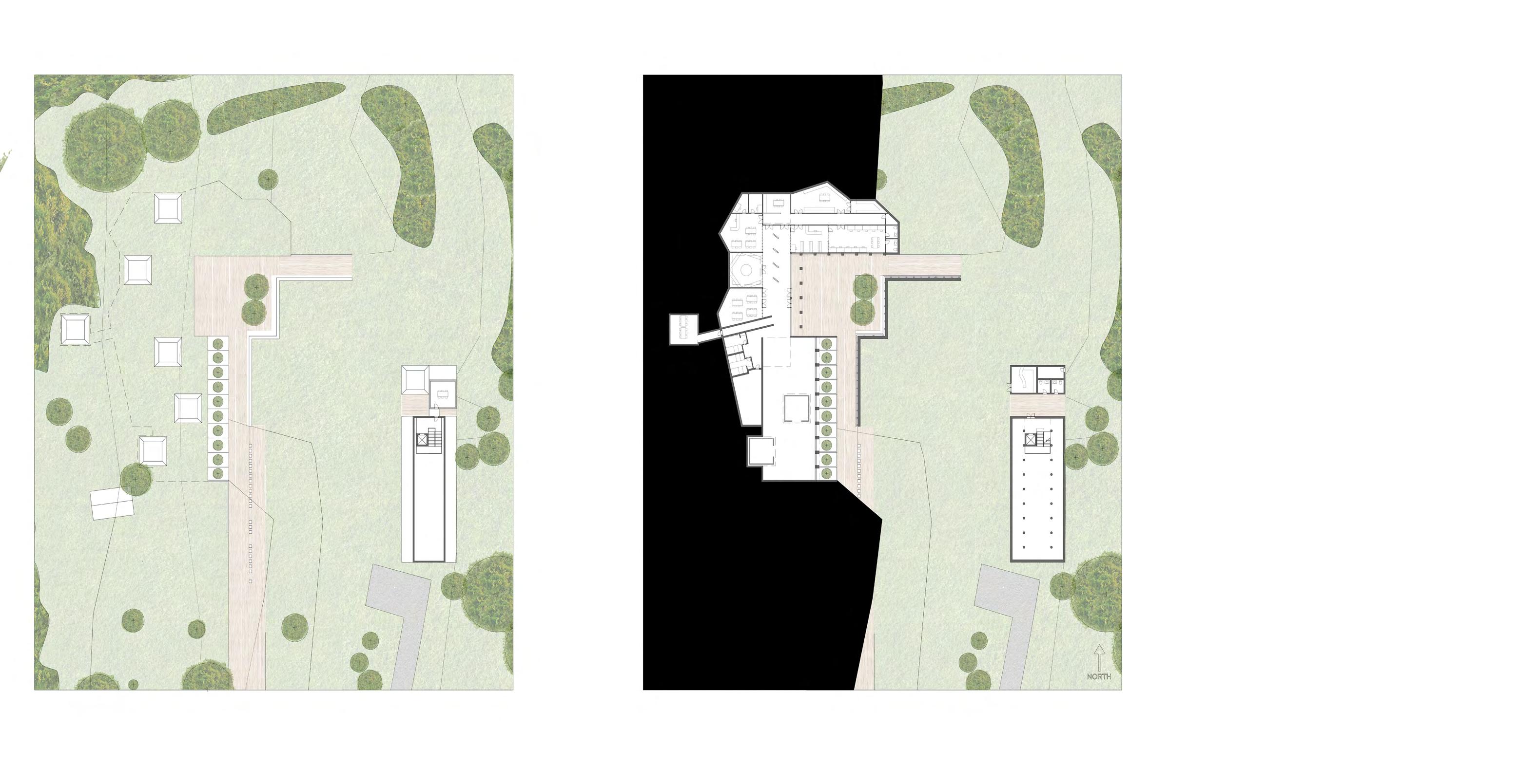 The lanterns on the site allow for the earth to be showcased as living in respect to Indigenous cultures. A sense of transparency is given with glass walls that allow light to enter the space. At daytime, light illuminates the ground below suggesting a program to occur. At night, the lanterns would be lit providing the spiritual sense of the land.